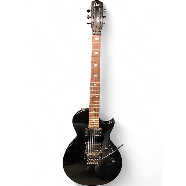 Used ESP KH203 Black Solid Body Electric Guitar in fair condition, featuring a basswood body, bolt-on maple neck, rosewood fingerboard with 24 extra-jumbo frets, and Kirk Hammett-designed Skull & Crossbones inlays. Powered by ESP-designed humbuckers and equipped with a Floyd Rose Special tremolo system, it's built for aggressive tones and solid playability. Signs of wear are present, but functionally sound—ideal for players seeking a hard-rock-ready ax at an affordable price.