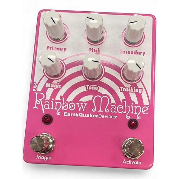 Used EarthQuaker Devices Rainbow Machine Polyphonic Pitch Mesmerizer in good condition, delivering lush pitch-shifted chorus, harmonies, and wild modulation textures. Controls include Pitch, Primary, Secondary, and Tracking, plus a Magic switch for instant warp. Rugged compact enclosure with true bypass switching, standard 1/4" mono in/out, and 9V DC center-negative power (approx. 30mA). Perfect for shimmering pads, detuned leads, and experimental soundscapes on guitar, bass, or synth.
