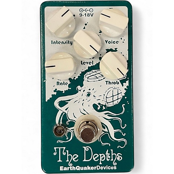 Used EarthQuaker Devices The Depths Optical Vibe Machine in great condition delivers lush, swirling uni-vibe modulation from subtle shimmer to deep, watery throb. Controls for Intensity, Rate, Voice, and Level make it easy to dial in classic pulse or modern movement, while a dedicated Throb switch adds extra low-end chew and texture. Housed in a rugged compact enclosure with standard 1/4" in/out and 9V DC center-negative power.