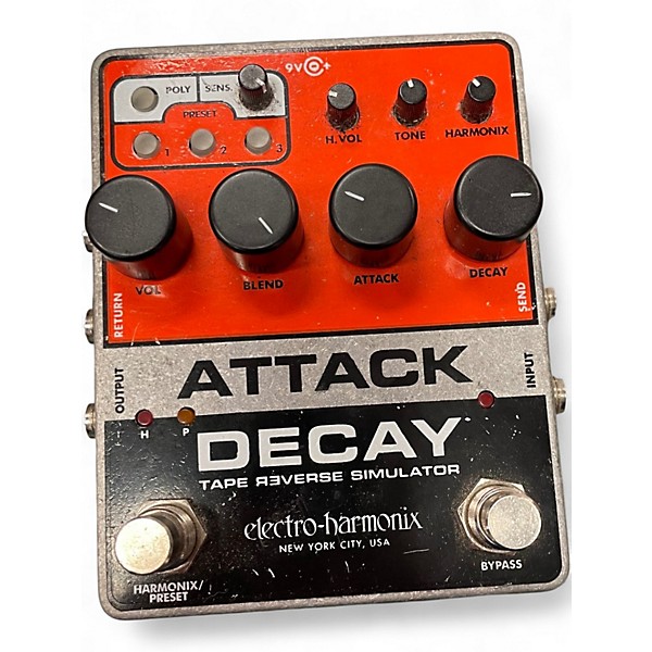 Used Electro-Harmonix Attack Decay Tape Reverse Simulator pedal in fair condition, offering vintage-style volume envelope control with polyphonic performance. Features include Blend, Sensitivity, and Attack/Decay time knobs, plus a built-in fuzz circuit. Ideal for achieving backward tape effects, swells, and layered textures. This unit shows moderate wear but functions properly, making it a great choice for experimental guitarists and sound designers seeking unique dynamic shaping. Powered via standard 9V DC center-negative power supply.