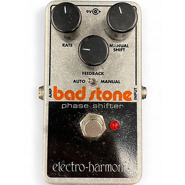 Used Electro-Harmonix Bad Stone Phase Shifter in great condition, delivering classic analog phasing from subtle swirl to deep, chewy sweep. Controls include Rate, Feedback, and a Manual/Auto mode with a Phase Shift selector for versatile textures on guitar, bass, and keys. Runs on standard 9V DC pedal power and features a rugged, gig-ready metal enclosure with true bypass switching for a clean signal when off.