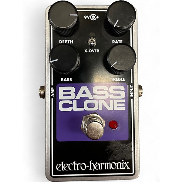 Add rich, dimensional chorus to your low end with this used Electro-Harmonix Bass Clone Analog Chorus bass effect pedal in good condition. An all-analog circuit delivers warm modulation tailored for bass, with Rate and Depth controls plus Bass and Treble EQ for dialing in everything from subtle shimmer to deep swirl. Use the X-Over switch to keep lows tight while chorusing the highs. Compact, road-ready design with standard 1/4" input/output and 9V DC power.