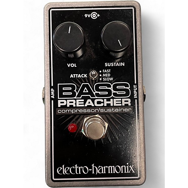 Used Electro-Harmonix Bass Preacher Bass Effect Pedal in great condition, delivering studio-style compression tailored for bass. Dial in smooth sustain or punchy attack with intuitive knobs for Volume, Sustain, and Attack, plus a selectable compression ratio for flexible dynamics control. True bypass switching preserves your core tone when disengaged, and the rugged, stage-ready metal housing is built to last. Ideal for leveling slap, fingerstyle, and pick playing with clarity and power.