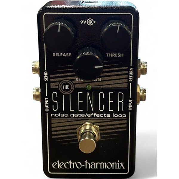 Tame unwanted hum and hiss with this used Electro-Harmonix Silencer Noise Gate in great condition. Designed for guitar and bass rigs, it delivers fast, transparent gating with adjustable Threshold and Release controls for everything from subtle cleanup to tight, choppy stops. The built-in FX loop lets you isolate noisy pedals while keeping your core tone intact. Standard 1/4" in/out and send/return connections make it easy to integrate into any pedalboard.