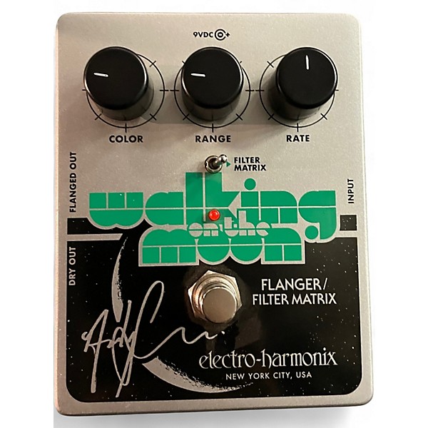 Capture iconic flanger tones with the used Electro-Harmonix WALKING ON THE MOON effect pedal, delivering lush modulation inspired by classic '80s sounds. This pedal features Rate, Depth, and Color controls for versatile shaping, along with a Filter Matrix mode for unique static effects. In great condition, it operates flawlessly and brings signature shimmer to any setup. True bypass ensures your tone stays pure when disengaged—ideal for guitarists chasing vibe-rich, atmospheric textures.