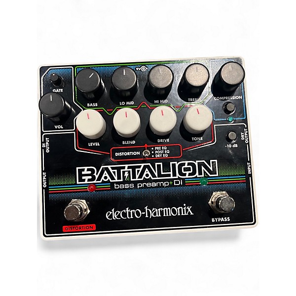 Enhance your bass tone with this used Electro-Harmonix Battalion Effect Pedal in great condition. Featuring MOSFET distortion, a 4-band EQ, compressor, and a noise gate, it delivers flexible tone shaping and powerful performance. With versatile routing options including XLR DI, 1/4" out, and headphone output, it's perfect for stage or studio. Compact yet packed with features, the Battalion is a must-have pedal for serious bassists seeking control and clarity.
