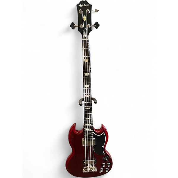 Used Epiphone EB-3 Cherry Electric Bass Guitar in excellent condition, featuring a mahogany body and neck with a classic cherry finish. This long-scale bass includes a Sidewinder neck humbucker and a Mini-Humbucker at the bridge for a deep, punchy tone. It has a rosewood fingerboard with trapezoid inlays and a 30.5" scale length for smooth playability. Ideal for rock and blues, this vintage-style bass delivers timeless looks with modern reliability.