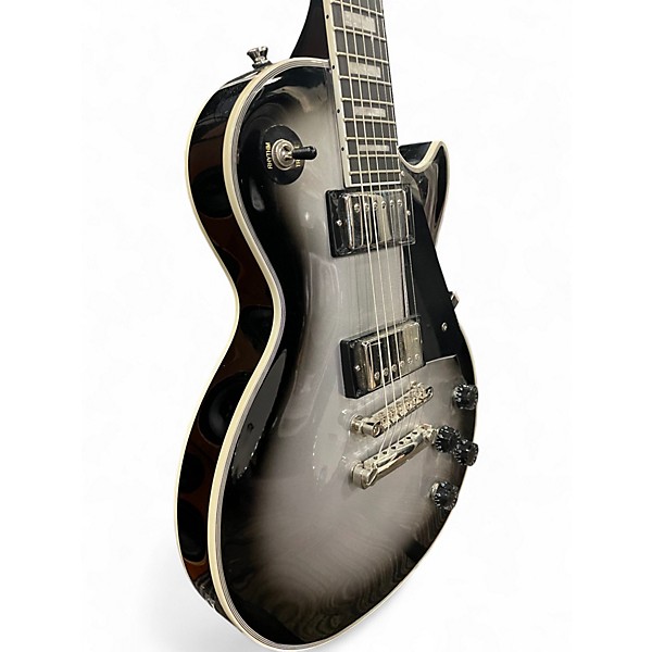 Used Epiphone Les Paul Custom Silverburst in Good condition, featuring a mahogany body with a maple top, mahogany neck with an ebony fretboard, and a classic Les Paul set-neck design. Equipped with dual humbuckers, Grover tuners, and gold hardware, this guitar delivers rich, punchy tones and reliable performance. Stylish Silverburst finish gives it a bold stage presence, perfect for players seeking timeless looks and versatile sound in a solid body electric guitar.