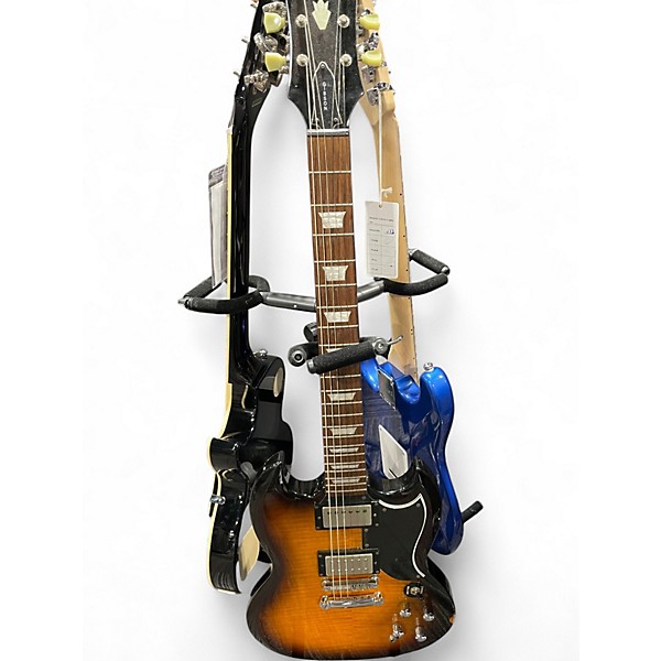 Turn up classic rock tone with this used Epiphone Vintage G-400 in a striking 2-Color Sunburst, in great condition and ready to play. Built with a comfortable solid-body SG-style design, it features a set neck for smooth sustain, a fast 6-string neck, dual humbucking pickups for thick, punchy output, and a 3-way selector with individual volume and tone controls for versatile sounds. Perfect for stage or studio.