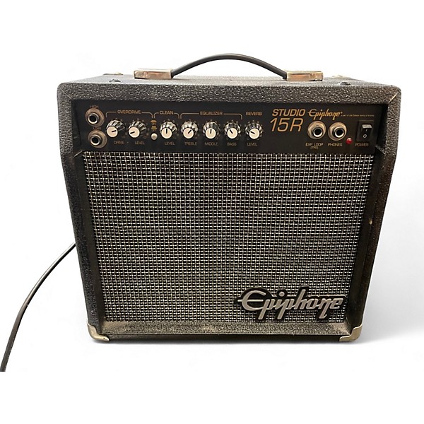 Used Epiphone Studio 15R Guitar Cabinet in fair condition. This compact 15-watt, solid-state amp features a single 8" speaker, built-in reverb, and both clean and gain channels for versatile sound options. Includes standard EQ controls and headphone output, making it suitable for practice or casual play. Shows signs of wear but functions as intended, delivering classic tones in a portable package ideal for beginners or budget-conscious musicians.