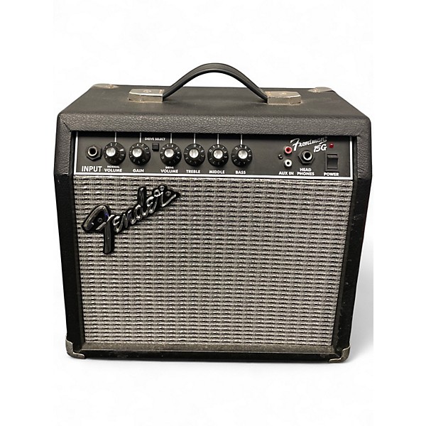 Used 2020s Fender Frontman 15G Guitar Combo Amp in great condition, delivering classic Fender clean tone and punchy overdrive in a compact practice-ready package. This 15-watt solid-state combo features an 8" speaker, Clean and Drive channels with gain and volume controls, 3-band EQ (bass, mid, treble), plus a headphone jack for silent playing and an auxiliary input for jamming along with tracks. Lightweight, reliable, and easy to dial in.