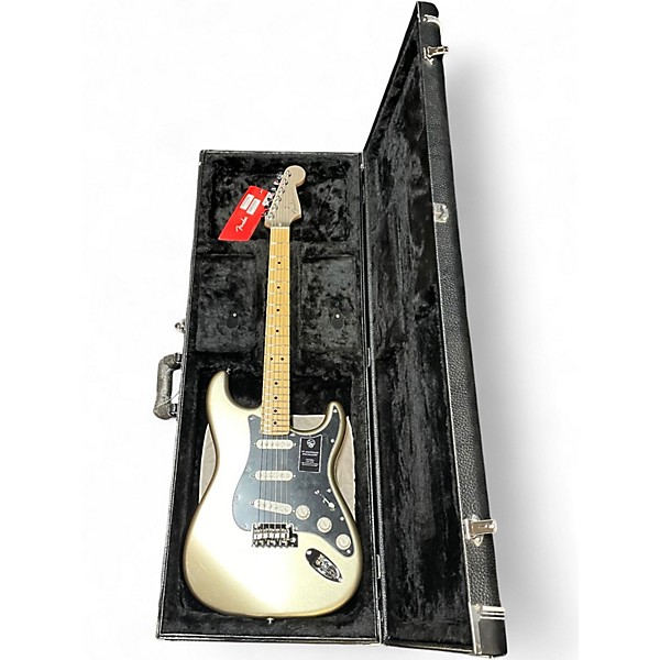Celebrate Fender heritage with this Used 75th Anniversary Stratocaster Diamond Anniversary solid-body electric guitar in Excellent condition. Built with a sleek Strat design, it features three Strat-style single-coil pickups, a 5-way selector, master volume and two tone controls for classic chime to biting leads, plus a vintage-style synchronized tremolo for expressive vibrato. Fast-playing maple neck and comfortable contoured body make it a versatile choice for stage or studio.