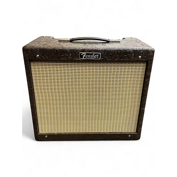 This used Fender Blues Junior Western 1x12 Tube Combo Amp is in excellent condition, delivering 15 watts of all-tube power through a 12" Eminence speaker. It features EL84 power tubes, spring reverb, FAT boost switch, and classic Fender tone in a compact, vintage-style cabinet with a distinctive western tooled tolex finish. Ideal for stage or studio, this dependable combo offers warm, rich tone and responsive dynamics for blues, rock, and country players alike.
