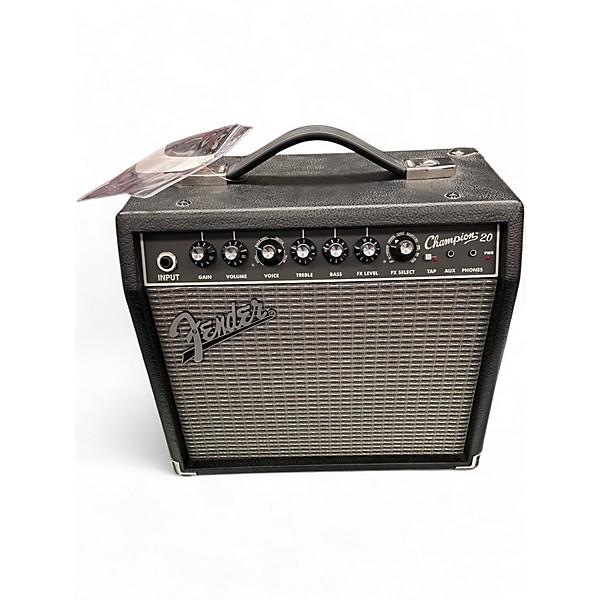 HTML: Used Fender Champion 20 Guitar Combo Amp in good condition, perfect for practice and small gigs. This 20-watt solid-state amp features an 8" Fender Special Design speaker, a range of onboard effects including reverb and delay, and multiple amp voicings for tonal versatility. With simple controls—volume, gain, voice, treble, bass, FX level, and FX select—it delivers classic Fender tone in a compact, reliable package ideal for beginners or seasoned players alike.