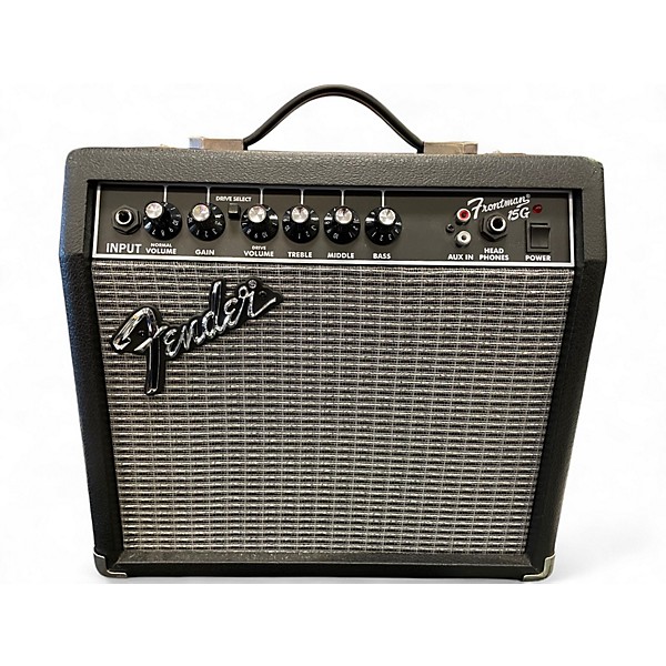 Used Fender Frontman 15G 15W Guitar Combo Amp in great condition, perfect for practice and small-room playing with classic Fender tone. This compact solid-state combo features a 6" Fender Special Design speaker, two channels (Clean and Drive), three-band EQ, and built-in headphone jack for silent sessions plus an auxiliary input for backing tracks. Lightweight and easy to carry, it delivers punchy cleans, gritty overdrive, and straightforward controls for quick dialing-in.