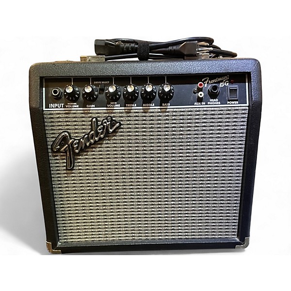 Used Fender Frontman 15G 15W Guitar Combo Amp in great condition, perfect for practice and small-room playing with classic Fender clarity. This compact solid-state combo features an 8" Fender Special Design speaker, two channels (Normal and Drive) with gain control, 3-band EQ (bass, mid, treble), plus built-in reverb for added depth. Includes 1/8" auxiliary input for backing tracks and a 1/4" headphone output for quiet sessions.