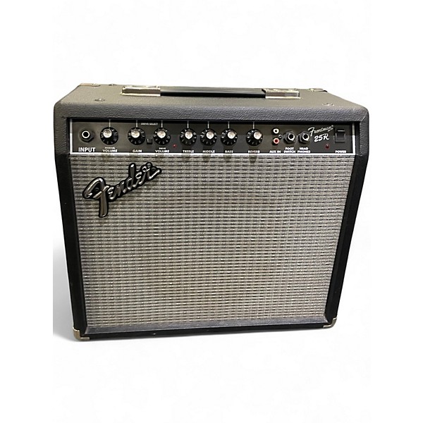 Used Fender Frontman 25R guitar combo amp in good condition, delivering classic Fender clean tones and punchy overdrive in a compact package. Rated at 25 watts through a 1x10" Fender Special Design speaker, it features two channels (Clean and Drive), a 3-band EQ, built-in spring reverb, and a headphone jack for quiet practice. Great for home, rehearsals, and grab-and-go gigs with reliable solid-state performance.