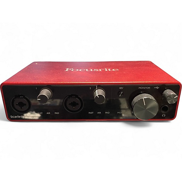 Unlock professional sound with this used Focusrite Scarlett 4i4 Gen 2 audio interface, in great condition. Featuring 4 inputs and 4 outputs, two Scarlett mic preamps with 48V phantom power, MIDI I/O, and pristine 24-bit/192kHz conversion, it's perfect for home studios and mobile recording. USB bus-powered and compatible with major DAWs, it delivers reliable, low-latency performance whether you're tracking vocals, instruments, or using MIDI controllers. Clean, compact, and ready to enhance your setup.