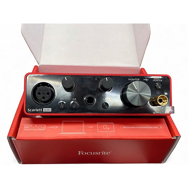 Used Focusrite Scarlett Solo Gen 3 audio interface in good condition, perfect for home recording and streaming. It features a high-headroom mic preamp with switchable Air mode, one XLR mic input and one 1/4" instrument input, plus balanced line outputs and a headphone jack. Record up to 24-bit/192 kHz via reliable USB bus power, with direct monitoring for low-latency tracking. Compact, durable, and easy to set up on Mac or PC.