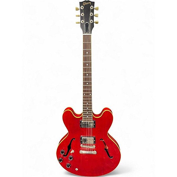 Used 2003 Gibson ES333LH Satin Red Hollow Body Electric Guitar in great condition, featuring a semi-hollow maple body, mahogany neck, and rosewood fretboard. Designed for left-handed players, it offers dual humbucking pickups, a 3-way toggle switch, and individual volume and tone controls. Its sleek satin red finish and vintage tone make it a standout choice for blues, rock, and jazz. This guitar delivers classic Gibson style with versatile performance.