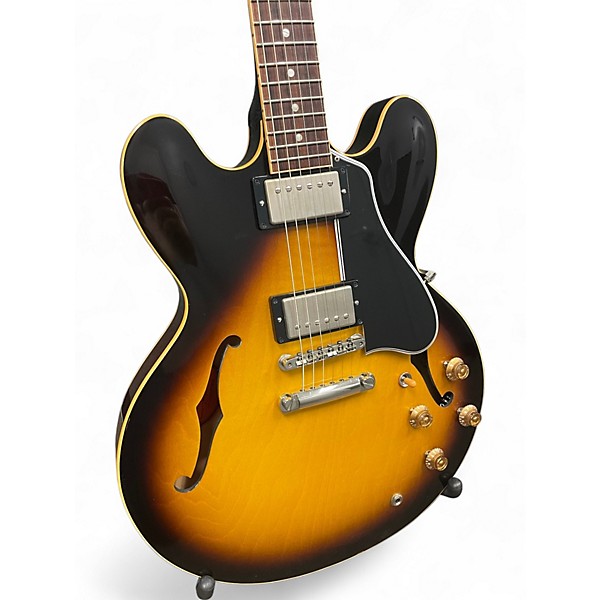 Celebrate timeless tone and craftsmanship with this used Gibson 1958 ES-335 50th Anniversary edition in stunning Vintage Sunburst. Crafted to honor the legendary debut of the ES-335, this hollow body electric guitar combines vintage-inspired aesthetics with modern reliability. Featuring a semi-hollow maple body with a solid maple center block, a one-piece mahogany neck, and a rosewood fretboard with dot inlays, it's built for rich resonance and articulate playability. Equipped with '57 Classic humbuckers, it delivers warm, balanced tones perfect for blues, rock, and jazz. The vintage sunburst finish captures true '50s style, and the guitar remains in great condition with minimal signs of wear. Whether you're a collector or performer, this limited-edition reissue offers the legendary tone and feel of a true classic. Don't miss your chance to own a piece of Gibson history.