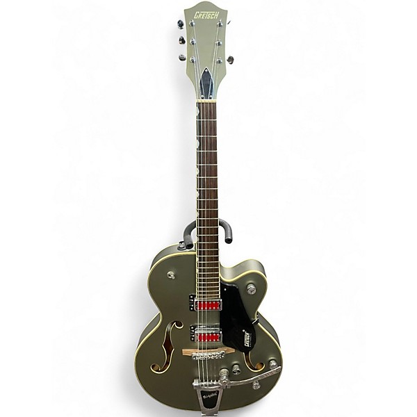 Bring classic Gretsch style to your rig with this used G5410T in Matte Phantom Metallic. This hollow body electric delivers big, airy resonance and punchy vintage-inspired tones, topped off with a smooth Bigsby vibrato for expressive shimmer. Featuring a comfortable single-cutaway body, dual humbucking pickups, master volume/tone controls, and a 3-way pickup selector, it’s ready for rockabilly, blues, and indie. This guitar is in good condition with typical cosmetic wear.