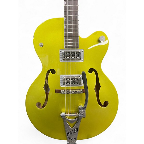 Experience fiery tone and vintage style with this Used Gretsch G6120T-HR Brian Setzer Signature Hot Rod Hollow Body in striking Lime Gold. Featuring dual TV Jones Classic pickups, a trestle bracing system, and a Bigsby B6C vibrato tailpiece, it delivers iconic rockabilly punch with modern clarity. The 24.6" scale maple neck with a rosewood fingerboard ensures smooth playability. In excellent condition, this guitar is a bold performer with signature flair and professional specifications.