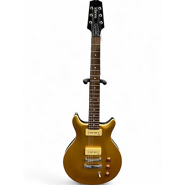 Used Hamer Sunburst A/T P90 Gold solid body electric guitar in excellent condition, featuring a carved maple top, mahogany body and set neck, and dual P-90 pickups for rich, vintage tone. It has a 22-fret rosewood fingerboard, Tune-o-Matic bridge, and Grover tuners for reliable performance. Finished in a stunning gold, this American-made guitar combines classic styling with superb playability, perfect for blues, rock, or retro-inspired tones. A top-tier choice for discerning players.