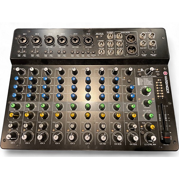 Used Harbinger LV14 Digital Mixer in good condition, featuring 14 total inputs including 8 XLR mic preamps, 2 stereo line channels, and built-in digital effects. This compact mixer offers 3-band EQ per channel, phantom power, and USB connectivity for easy recording or playback. Ideal for live performances, rehearsals, or small studio setups, the LV14 delivers reliable performance and intuitive control in a durable design perfect for musicians and audio engineers alike.