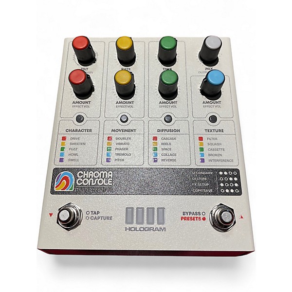 Used Hologram Chroma Console Effect Processor in great condition, delivering lush multi-voice modulation, pitch-shifting, delay, reverb, and granular-style textures in a compact desktop unit. Hands-on controls and preset memory make it easy to dial in shimmering choruses, detuned spreads, and ambient soundscapes fast. Stereo input/output, MIDI control, and standard instrument/line-level operation integrate smoothly with pedalboards, synths, and studio rigs. A powerful creative processor for players who want big, animated color.