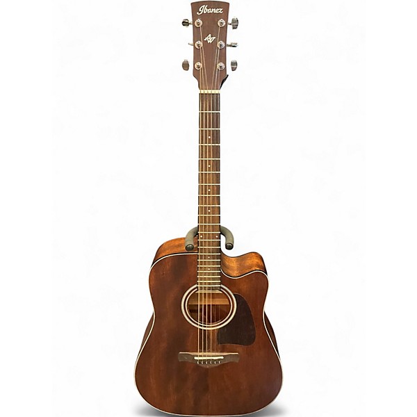 Used 2021 IBANEZ AW5CE-OPN Mahogany Acoustic Guitar in Good condition, featuring a solid mahogany top with mahogany back and sides for warm, rich tone. Equipped with a cutaway dreadnought body and Ibanez electronics for easy on-stage performance. The open pore finish enhances resonance and natural look, while the comfortable neck profile ensures smooth playability. Ideal for singer-songwriters and performers seeking reliable tone and build in a well-maintained, affordable acoustic-electric guitar.