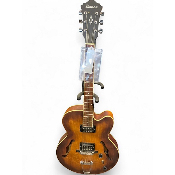 This used Ibanez AF55TF Hollow Body Electric Guitar is in great condition, featuring a warm, resonant tone with a full mahogany body and set-in mahogany neck. The tobacco flat finish highlights its classic style, while dual ACH-ST humbuckers deliver smooth jazz to blues tones. A rosewood fretboard, 20 medium frets, and ART-ST bridge ensure comfortable playability and solid tuning stability—perfect for players seeking vintage vibe and rich sound in a reliable hollow body guitar.