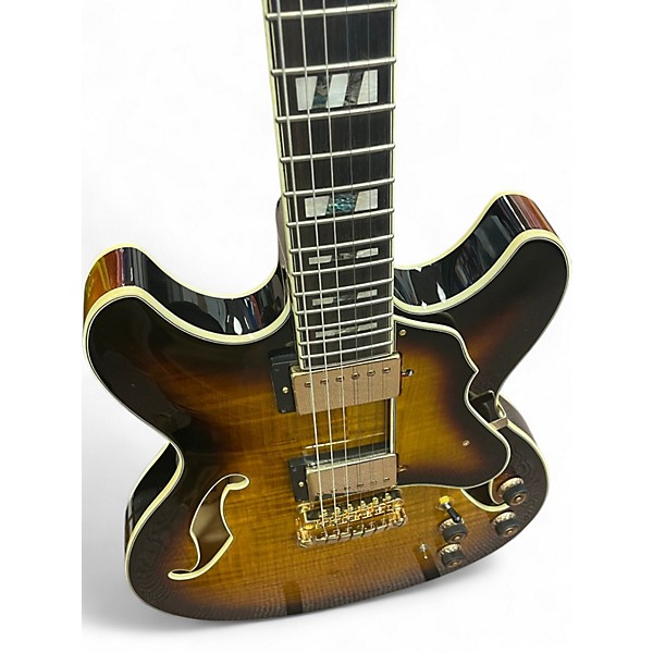 Used Ibanez AS153A Artstar in Antique Yellow Sunburst, this hollow body electric guitar is in great condition and delivers warm, rich tones with its Super 58 humbucking pickups. Featuring a 3-piece mahogany/maple neck, bound ebony fretboard, and flamed maple top, back, and sides, it's built for smooth playability and vintage-inspired sound. The AS153A’s classic semi-hollow construction offers excellent sustain and versatility, making it ideal for jazz, blues, or rock.