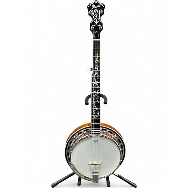 Used Ibanez B200 5 String Natural Banjo in excellent condition, featuring a mahogany rim, neck, and resonator with a stylish vintage inlay design. This banjo includes a rolled brass tone ring for bright, clear sound and a smooth-playing rosewood fretboard. With its classic 24-lug configuration and geared 5th tuner, it's built for dependable tuning and rich tone. Ideal for bluegrass enthusiasts or players seeking quality craftsmanship in a traditional five-string banjo.