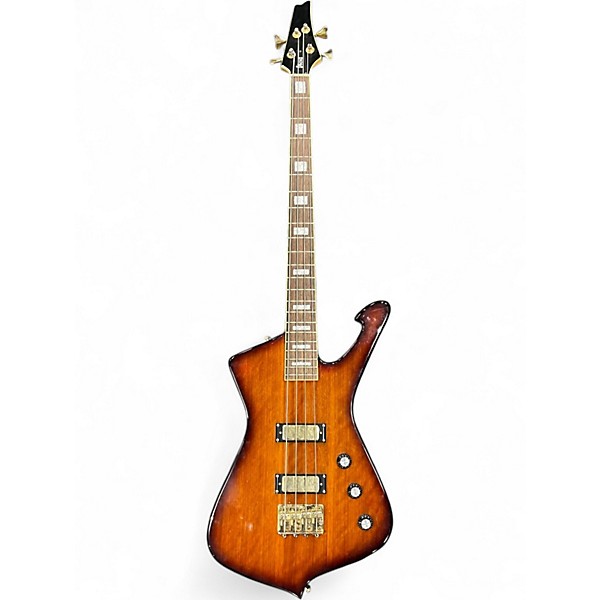 Used Ibanez ICB200 electric bass guitar in striking Brown Sunburst finish, featuring a classic Iceman body shape, maple neck, and rosewood fingerboard. Dual Ibanez PFR pickups deliver powerful, balanced tone with active EQ controls for versatile sound shaping. This four-string bass is in good condition with moderate signs of use, ideal for players seeking distinctive style and solid performance. 34" scale length and chrome hardware complete this reliable, stage-ready instrument.