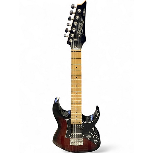 This used Ibanez miKro GRGM21M in Walnut Sunburst is a compact solid-body electric built for fast, comfortable playing in a smaller 3/4-size design. In good condition, it features a 22.2" scale, maple neck, purpleheart fretboard with 24 frets, a hardtail bridge for stable tuning, and dual Infinity R humbuckers with simple volume/tone controls and a 5-way switch for versatile tones.