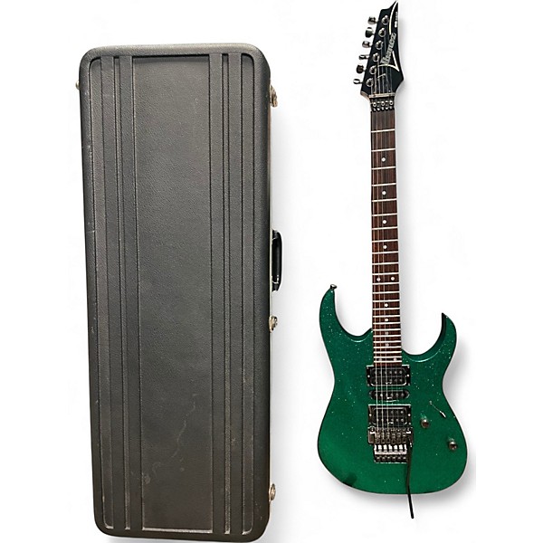 Vintage 1996 Ibanez RG-570 in striking green sparkle finish this solid body electric guitar is in excellent condition and features a basswood body, maple neck with rosewood fretboard, 24 jumbo frets, and the legendary Edge tremolo system. Equipped with HSH pickup configuration for versatile tones, it's built for speed and precision—an ideal choice for shredders and collectors alike. A rare find that combines iconic 90s style with professional performance. Comes with a hardshell case