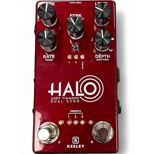 Used Keeley HALO Andy Timmons Dual Echo in great condition, offering pristine ambient delays and lush modulation effects. This stereo delay pedal features two delay engines, tap tempo, eight programmable presets, and true bypass switching. Designed in collaboration with guitarist Andy Timmons, it delivers immersive, rhythmic, and ambient textures ideal for any style. Runs on standard 9V power and includes stereo inputs/outputs for full signal routing flexibility. A top-tier pedal for professionals and tone enthusiasts alike.