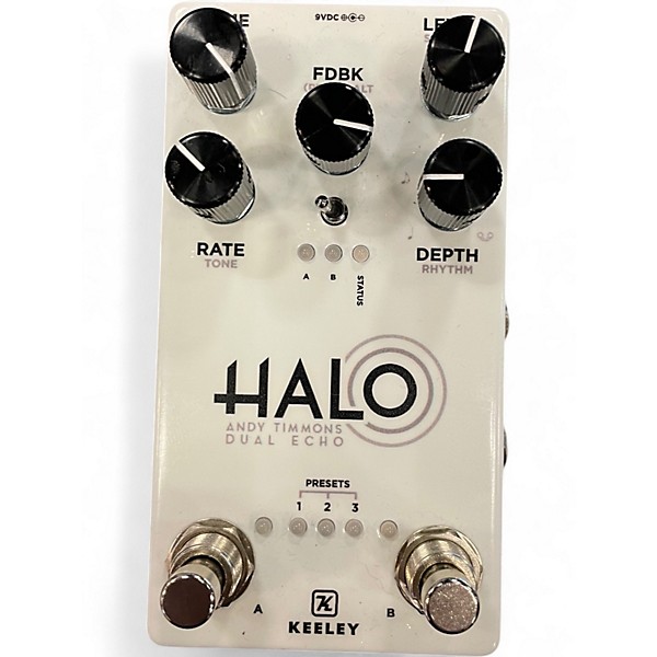 Used Keeley HALO Andy Timmons Signature Delay pedal in great condition. This dual-delay effect offers rich, modulated echoes with stereo operation, trails mode, and tap tempo functionality. Featuring eight factory presets and true bypass switching, the HALO delivers ambient textures and rhythmic precision. Powered by standard 9V DC, it's compact, gig-ready, and perfect for creating lush, expansive soundscapes. Ideal for guitarists seeking studio-quality tone shaping in a user-friendly, dependable format.
