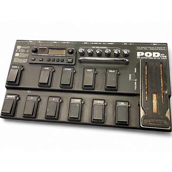 Used Line 6 POD XT Live amp modeler and multi-effects processor in great condition, delivering classic amp, cab, and effect tones for stage or studio. Foot-controlled performance with built-in expression pedal, rugged metal chassis, and easy-to-read display makes dialing in sounds fast. Features amp modeling, modulation, delay, reverb, and more, plus onboard preset storage. I/O typically includes instrument input, stereo outputs, headphone out, and USB for computer connectivity and editing.