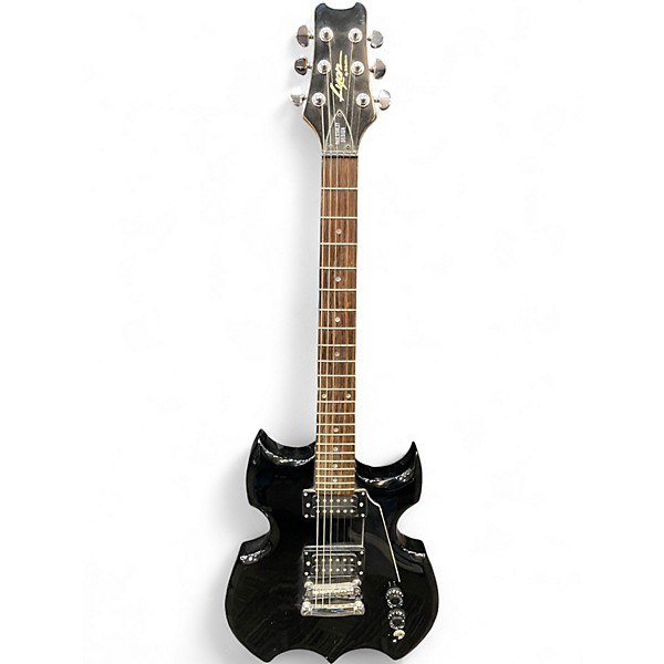 Used Lyon Company Paul Stanley Black Solid Body Electric Guitar in fair condition. This eye-catching guitar features a sharp, angular body design inspired by rock legend Paul Stanley. It has a bolt-on neck, rosewood fretboard, dual humbucking pickups, and a 3-way selector switch for a range of powerful tones. Perfect for aspiring shredders or collectors, this guitar shows some wear but plays well and delivers that signature hard rock sound.