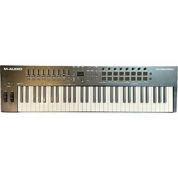 Used M-Audio Oxygen Pro 61 MIDI Controller in good condition, offering a responsive 61-key semi-weighted keyboard with aftertouch for expressive playing. Create faster with 16 RGB drum pads, 9 faders, 8 knobs, and transport controls for hands-on DAW mixing and performance. USB-powered and class-compliant for easy plug-and-play, it also features MIDI Out for controlling external gear, plus pitch/mod wheels and smart scale/chord modes for inspired songwriting and production.