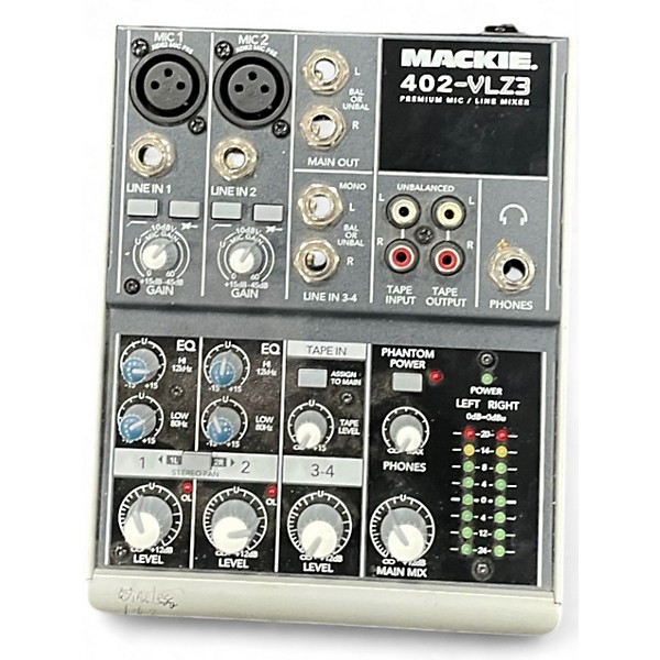 Used Mackie 402VLZ3 Unpowered Mixer in great condition, offering premium sound and reliability in a compact design. This rugged 4-channel mixer features two Onyx mic preamps and high-headroom, low-noise performance, perfect for small recording setups or live applications. With XLR and TRS inputs, plus balanced outputs, it delivers pro-level quality in a portable form. Ideal for solo artists or podcasters seeking clear, professional audio without the bulk.