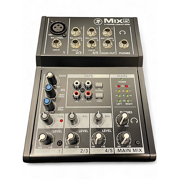 Used Mackie MIX 5 Unpowered Mixer in great condition, perfect for small setups or portable use. Features 5 channels including one mic/line input with studio-level preamp, stereo line inputs, and dedicated stereo RCA inputs. Compact and easy to use, it delivers clean sound with 2-band EQ on the mic channel and a headphone output with independent volume control. Ideal for musicians, podcasters, or home studios seeking reliable, high-quality mixing functionality in a rugged design.