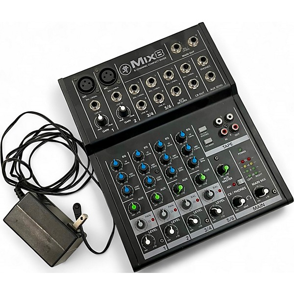 Used Mackie MIX8 8-channel compact mixer in good condition, perfect for small live sound or home studio setups. It features 2 mic/line inputs with studio-level preamps, 2 stereo line inputs, 3-band EQ on channels 1 and 2, and dedicated stereo RCA inputs/outputs. Rugged metal chassis ensures durability, and the intuitive layout makes operation simple. Reliable and clean-sounding, this unpowered mixer is ideal for musicians, podcasters, or anyone needing flexible, straightforward audio control.