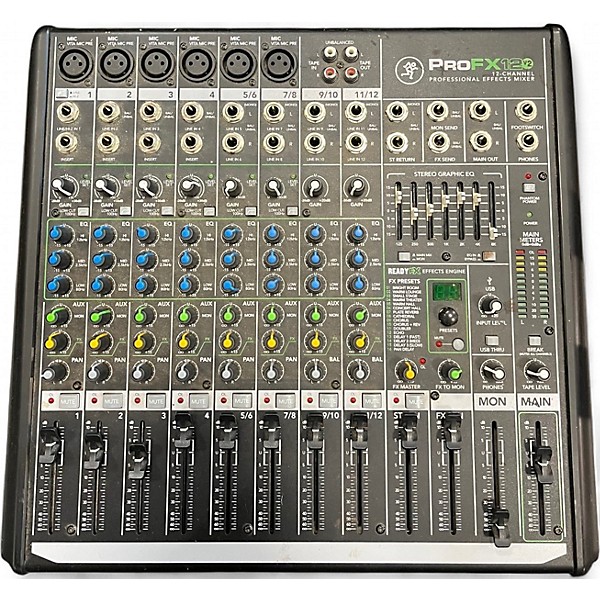 Used Mackie PROFX12V2 Unpowered Mixer in Good condition, offering 12 channels with 6 low-noise Mackie Vita mic preamps and ReadyFX effects engine with 16 built-in effects. Features include 3-band EQ, aux send, USB interface for recording and playback, and balanced XLR and 1/4" outputs. Perfect for small live performances and home studios, this mixer delivers professional sound quality and intuitive control in a compact, rugged design.