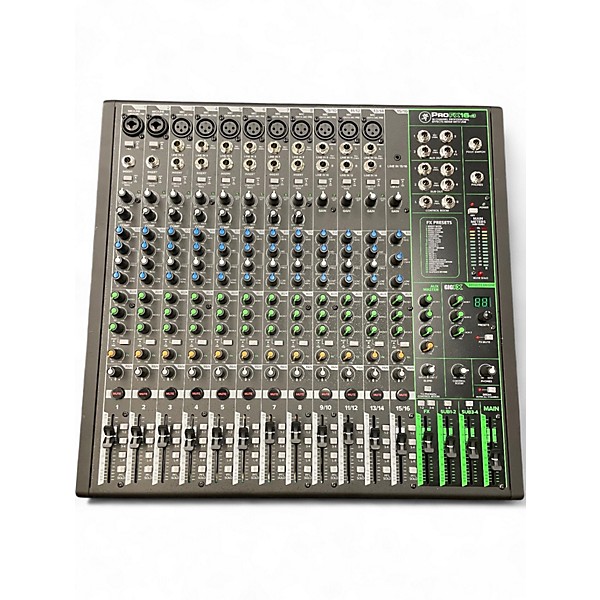 Used Mackie ProFX16v3 unpowered mixer in excellent condition, delivering Pro-grade mixing with 16 channels, 11 Onyx mic preamps, 24 built-in effects, and a 2x4 USB audio interface for easy recording and playback. Equipped with 3-band EQ, one-knob compression on select channels, high-resolution GigFX processing, and flexible routing for live sound, rehearsal, or streaming, it’s a reliable, great-sounding centerpiece for any setup.
