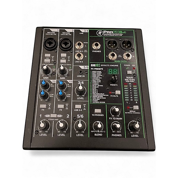 Used Mackie PROFX6 V3 Unpowered Mixer in great condition. This compact 6-channel mixer features 2 Onyx mic preamps, 24-Bit/192kHz USB recording, and GigFX effects engine with 24 built-in effects for live or studio use. Ideal for solo performers or small setups, it offers professional sound and simple USB connectivity. Rugged and reliable, it's perfect for capturing high-quality audio on-the-go or in your home studio.