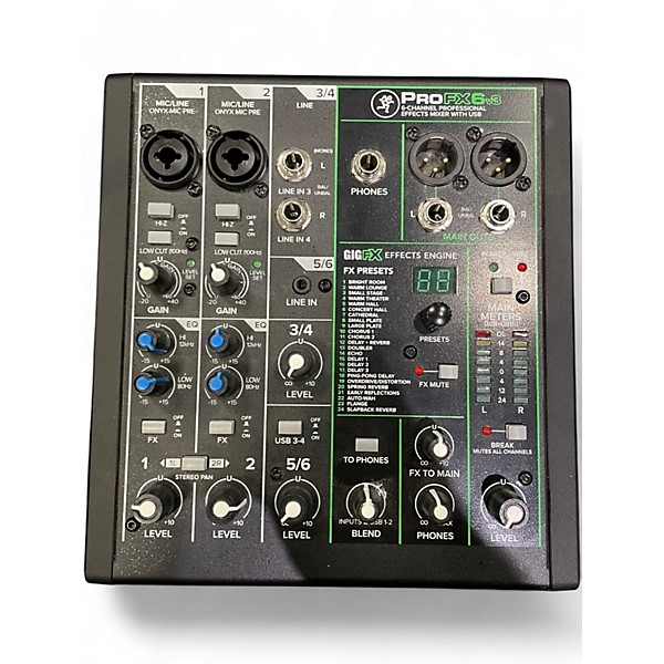 Used Mackie PROFX6V3 Unpowered Mixer in good condition, perfect for small gigs, podcasting, or home recording. Features 2 Onyx mic preamps with 48V phantom power, 2-band EQ, GigFX effects engine with 24 effects, and USB connectivity for easy recording. Compact and reliable, it offers professional sound in a portable 6-channel format. Ideal for musicians and creators seeking high-quality audio performance on a budget.