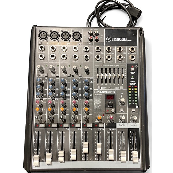 Used Mackie PROFX8 Unpowered Mixer in great condition, ideal for live sound or studio setups. Features 8 channels, 4 low-noise mic preamps, 3-band EQ on all channels, built-in digital effects, and a USB interface for easy recording and playback. With rugged construction and intuitive controls, it delivers reliable performance and clean sound. Perfect for musicians, podcasters, or small venues seeking professional-grade audio mixing without the bulk or complexity of a larger console.